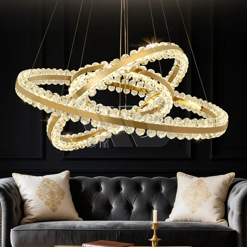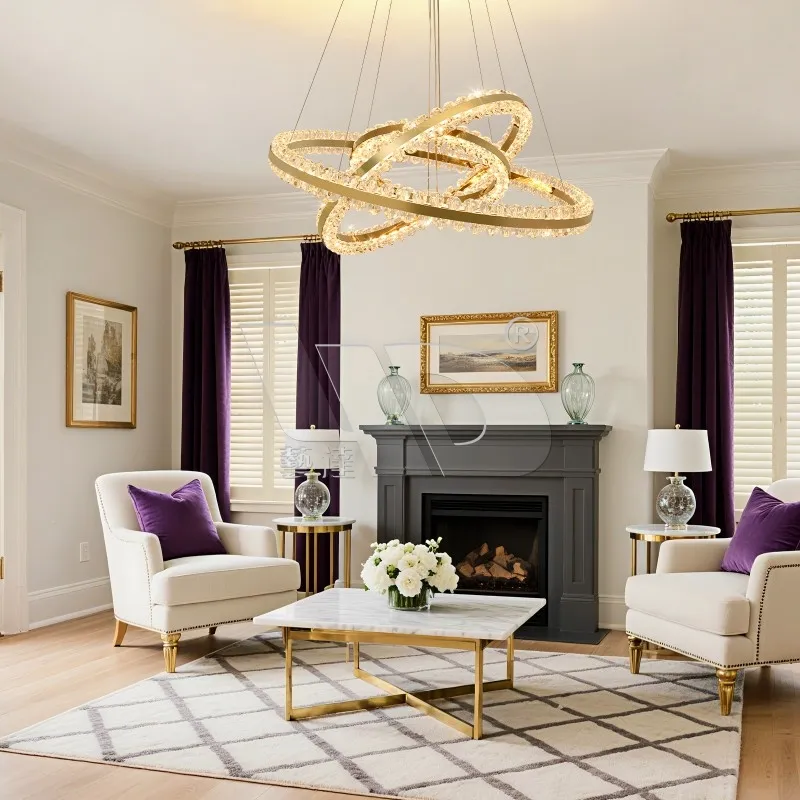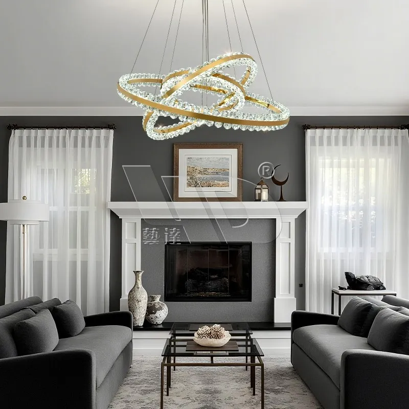 When you step into a room like the cozy, polished living room in the photo, your gaze doesn’t land on the couch or the art first—it locks on this 6-Ring Glass Chandelier. It’s the kind of piece that makes people pause mid-conversation to ask, “Where’d you get that?” Those six twisted, soft gold-toned rings aren’t just “hanging”—they wrap around each other like a tiny, glowing cosmic cluster, the sort of sculpted shape that feels playful but still luxe.