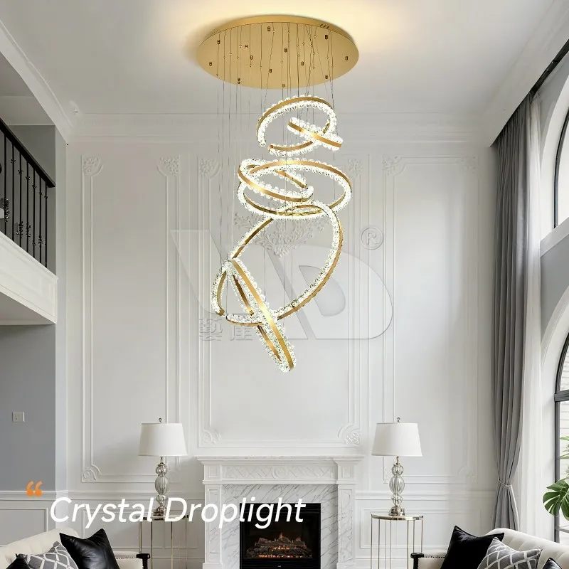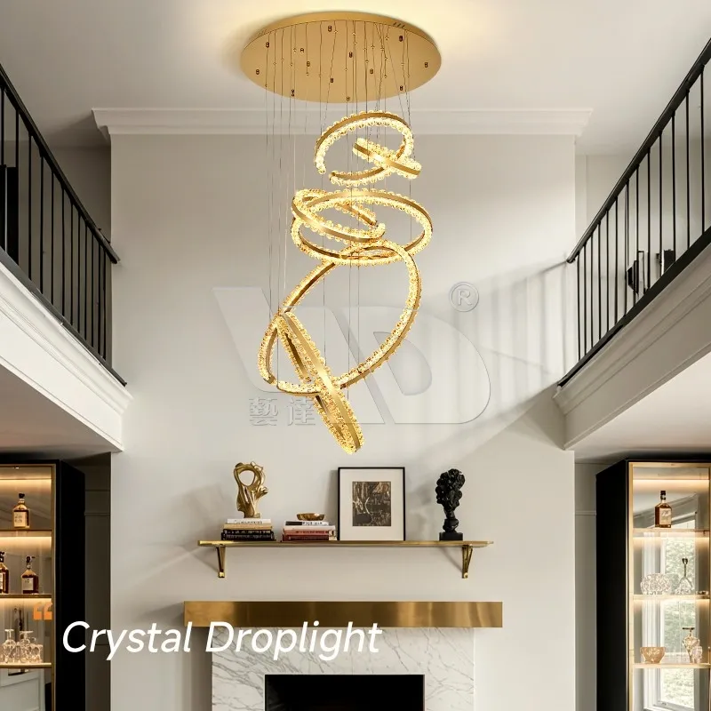 Design & Vibe: Six intertwined circular rings (sculptural, flowing, and unapologetically luxe) lined with faceted glass, suspended from a polished gold ceiling mount. It’s made for spacious spaces—large living rooms, upscale entryways, or boutique hotel lobbies—adding a statement without feeling overcrowded.