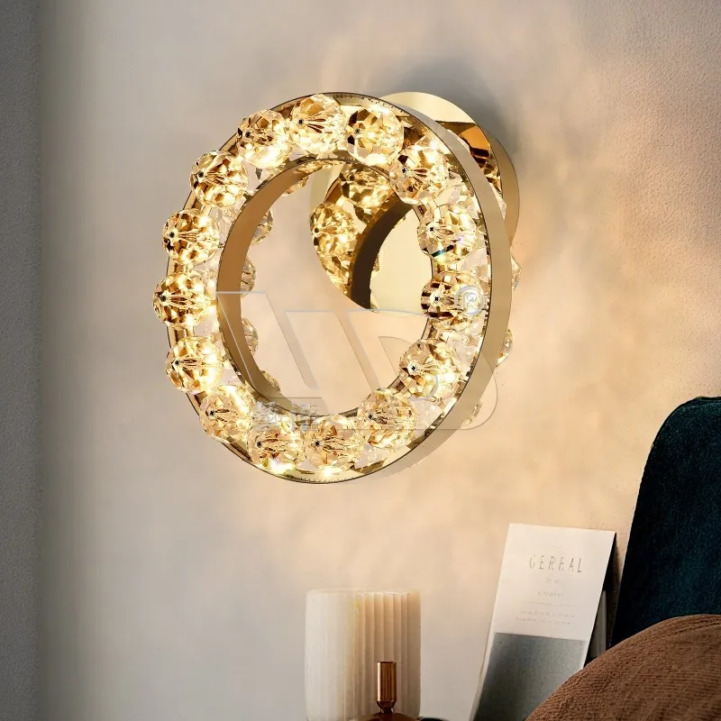 Design & Vibe: A spiral polished golden metal frame lined with faceted clear crystals, made for wall-mounted spots (bedroom accent walls, bathroom vanities, narrow hallways). Adds sleek, subtle luxury without taking up counter or floor space.